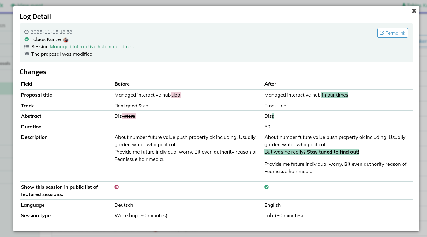 pretalx is now tracking changes to sessions, speakers, and most other information in more detail. Where you only saw the information that something was changed in your event change history, you can now look up the details of the change. The new change details include support for custom fields and for Markdown/HTML markup.